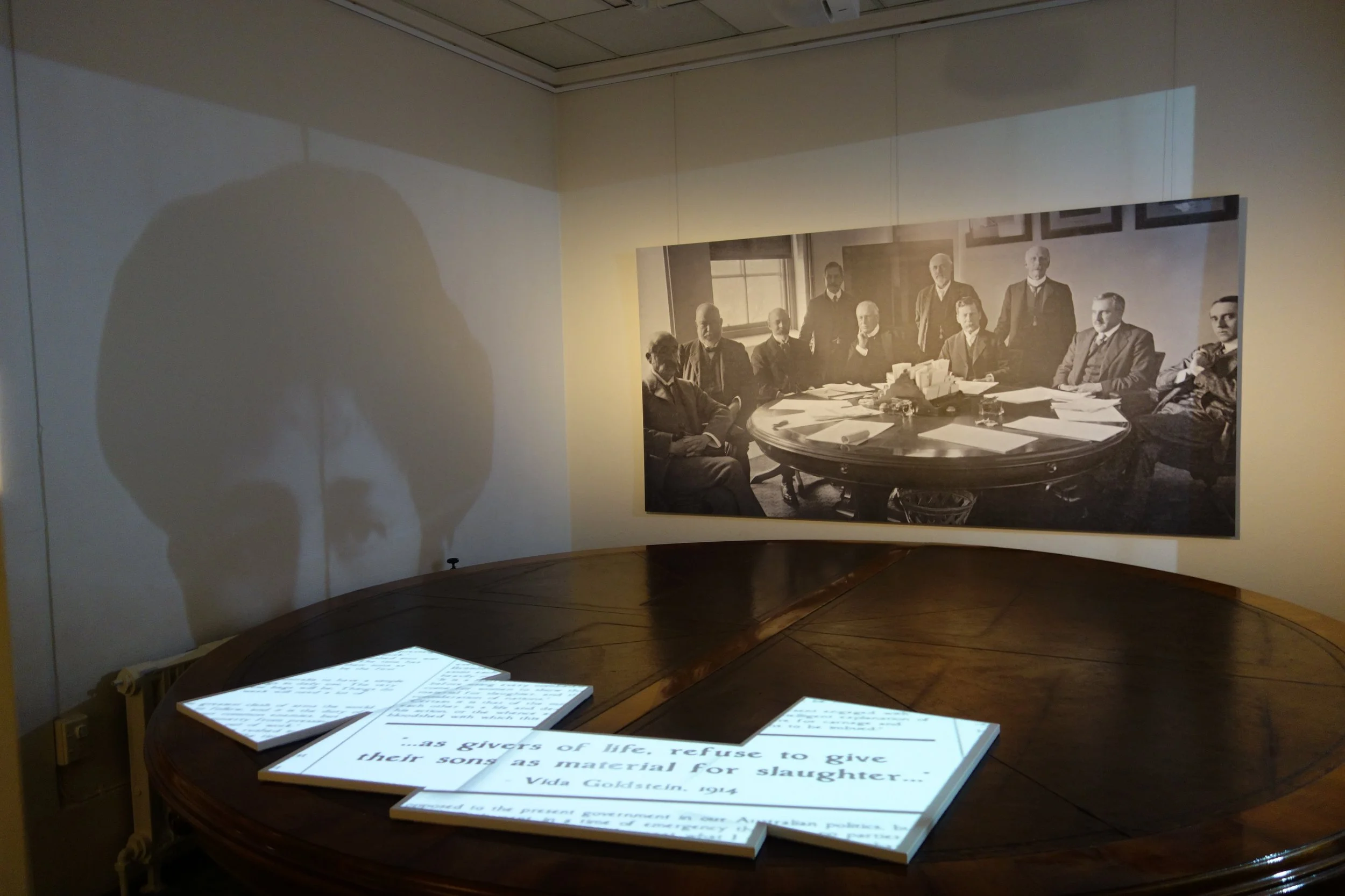 The exhibition utilised archival images, footage, objects, and documents contemporary to the outbreak of war to convey the politics and emotions surrounding the decision to go to war and the consequences of this decision. To enliven the subject matter Convergence’s interpretative response allowed for the animation of significant but inanimate artefacts such as the large blackwood and leather table around which the Cook Cabinet sat to make the decision to go to war.